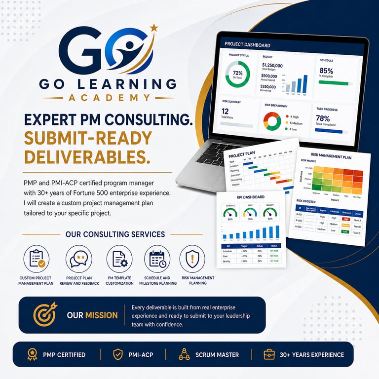PMP and PMI-ACP certified program manager with 30+ years of Fortune 500 enterprise experience — every deliverable is ready to present to your leadership team with confidence.